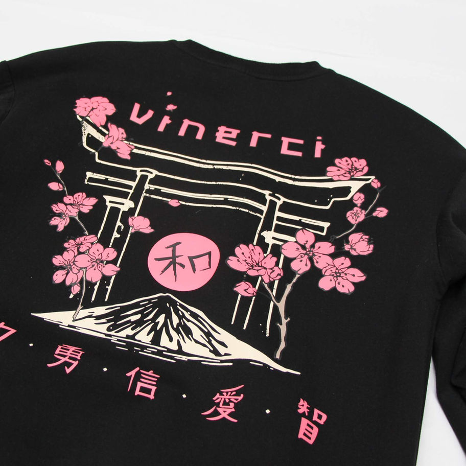 Design: This black crewneck features a large torii gate design on the back and a stylized logo on the front. With a clean, modern look and a comfortable fit, it's perfect for everyday wear.